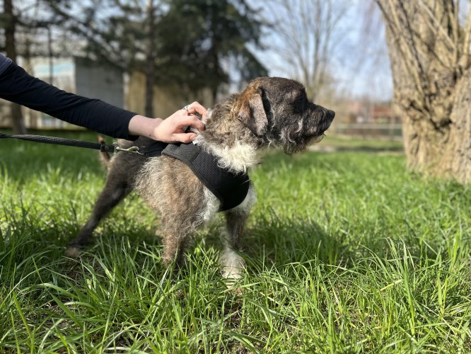 Floki to 9-letni pogodny, kontaktowy pies, który najbardziej ceni bliskość człowieka. Chętnie spaceruje, bawi się piłką i z radością współpracuje – zna podstawowe komendy, ładnie chodzi na smyczy i skupia się na opiekunie.