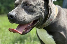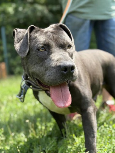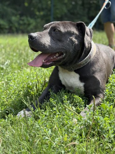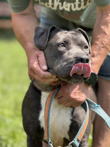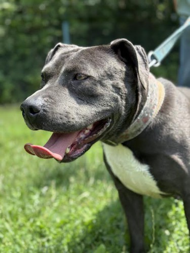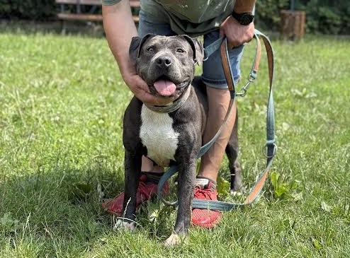 Zula ma około 3 lat i jest uroczą suczką w typie amstaffa, która mimo dojrzałego wieku wciąż tryska radością jak szczeniak.