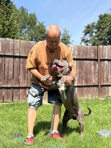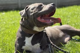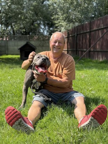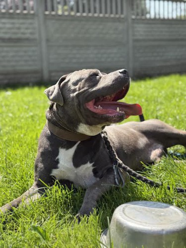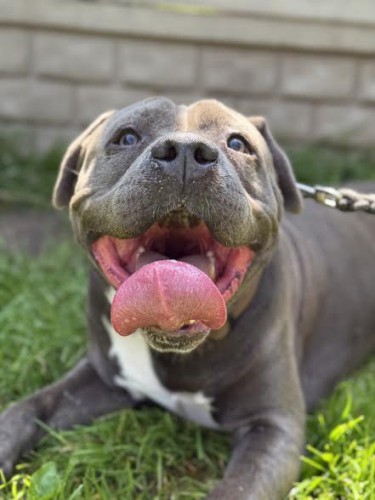 Revers to 5 letni pies w typie amstaffa z duszą szczeniaka.