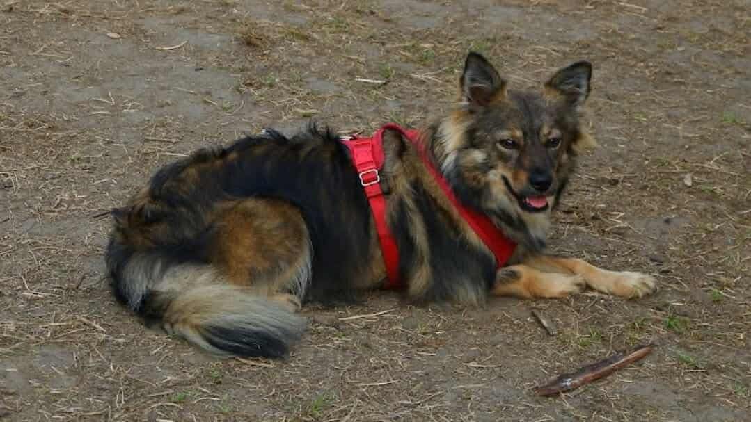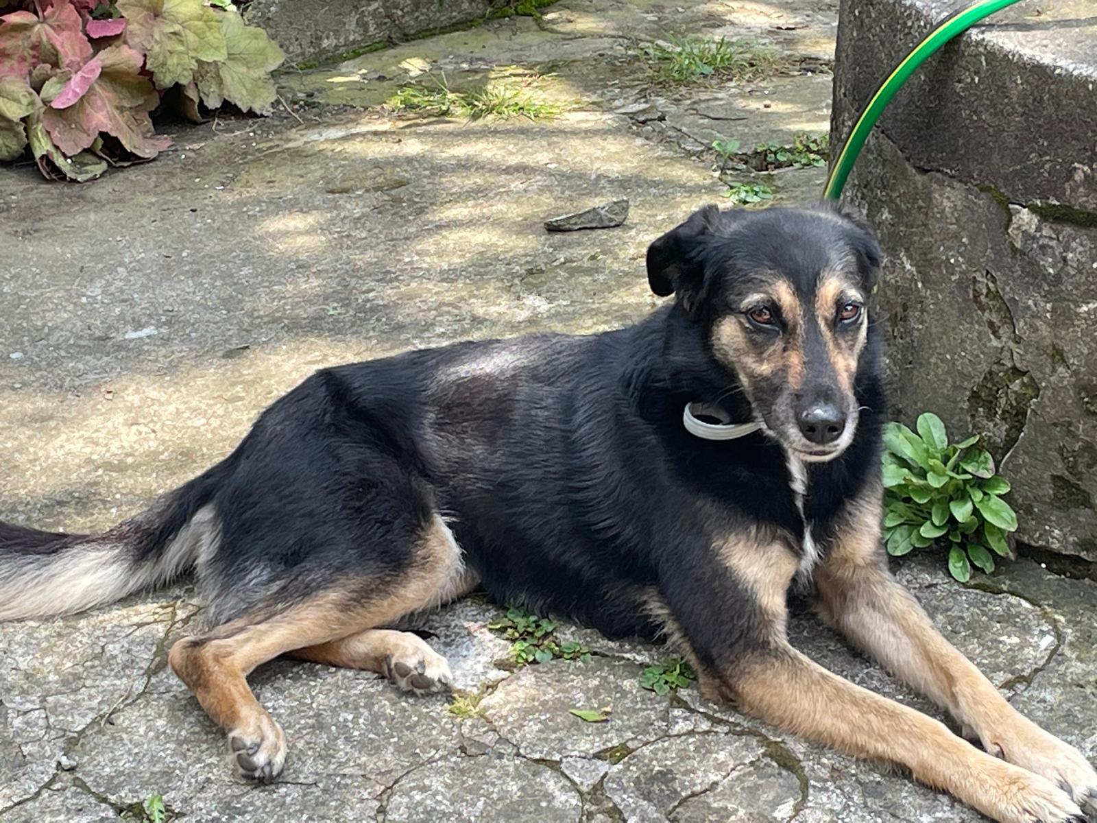 Przycięte lewe uszko, szara obroża przeciwpchelna |