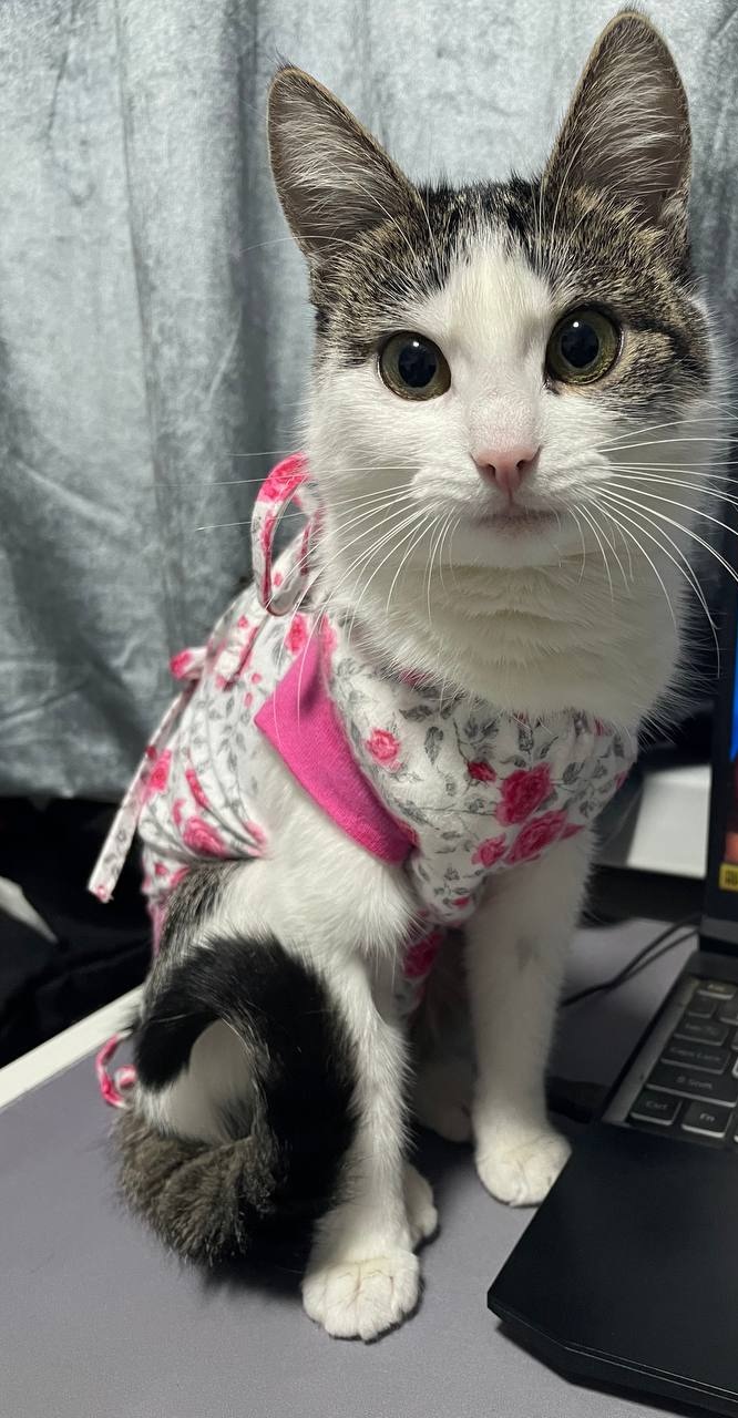 Kotka niedawno przeszła operację. Ma wygolony brzuch oraz niewielki fragment sierści wygolony na przedniej łapce. |